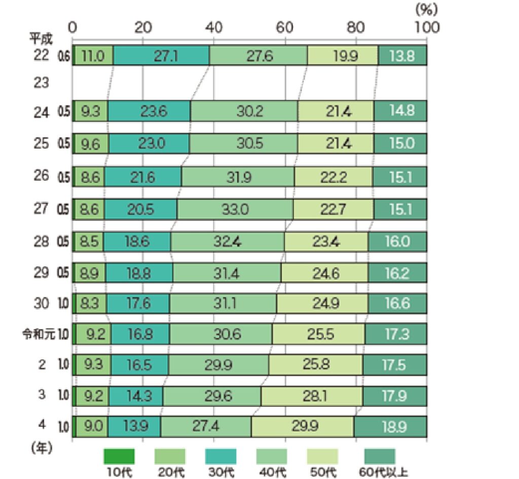 図1は道路貨物運送業の年齢階級別就業者数の割合を示しています。50代以上の割合は年々増加しており、高齢化が進んでいます。会社を存続させていくにはこういった方々にいかに長く元気に働いていただくかがポイントとなります。
