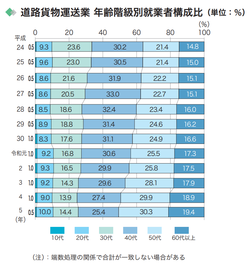 全日本トラック協会の2024年の調査によると、50代以上のドライバーの就業割合は年々増加傾向にあり2023年時点で道路貨物運送業における就業者のうち約半数を50代以上のドライバーが占める結果となりました。
