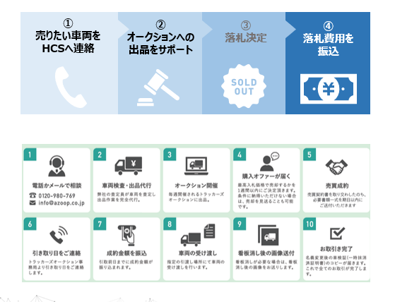 トラックのオークション出品をフルサポートします。オークション中間業者のコストをカットでき、高価格で売却が可能になります。