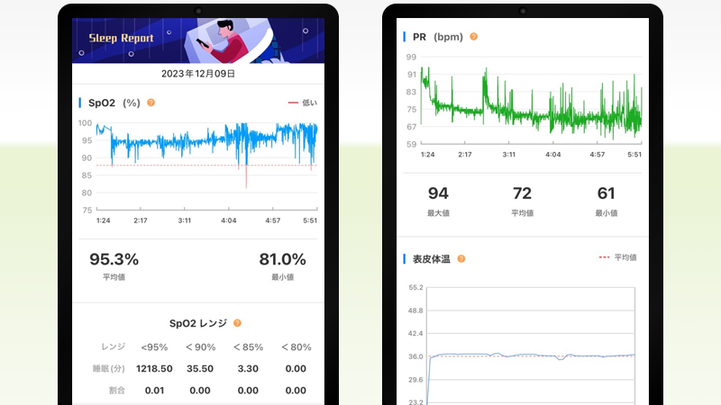 睡眠を妨げずにSASスクリーニング検査が可能で、SpO₂や脈拍数を1秒単位で測定。