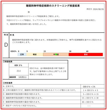 本機器で出た本結果票をご持参の上、専門の医療機関の受診をお勧めいたします。医療機関で必要な判断材料の血中酸素飽和度の降下指数、ODI3(1時間あたりに酸素飽和度が基準から3%以上低下した回数)を示してあります。