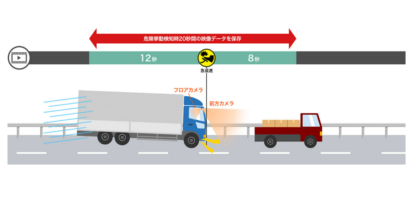 docomapEyeは、急ハンドルや急加減速などの危険挙動を検知すると、自動で前12秒・後8秒の計20秒の映像と音声をクラウドにアップロード。DoCoMAPの画面から、いつでも動画を確認できます。