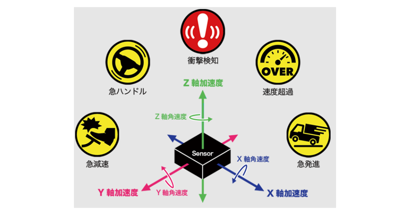 従来のDoCoMAP機能に加え、安全対策と事故検知が可能に。3軸加速度センサーと車速パルスで正確に危険挙動を検知し、遠隔操作で映像取得も可能です。