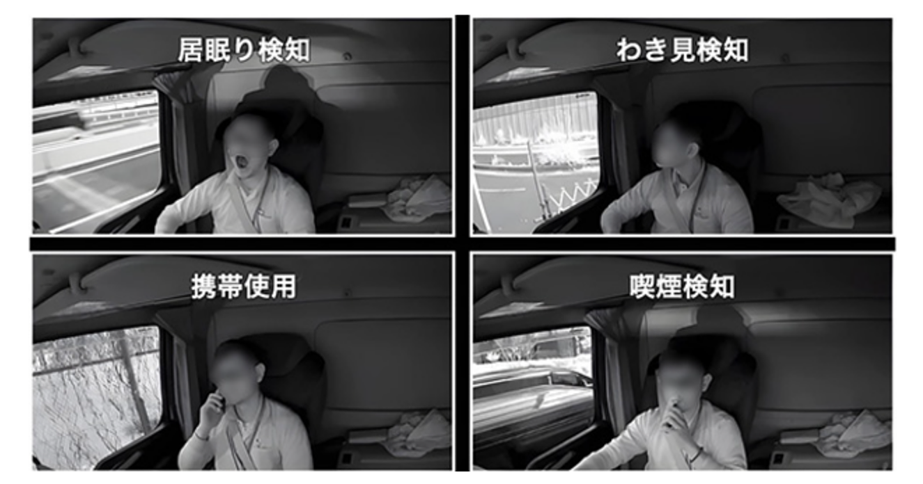 オプションのDMSカメラを取り付けることにより、ドライバーの居眠り運転、わき見運転、携帯電話の使用や喫煙動作がAI画像解析エンジンにより判定可能になります。