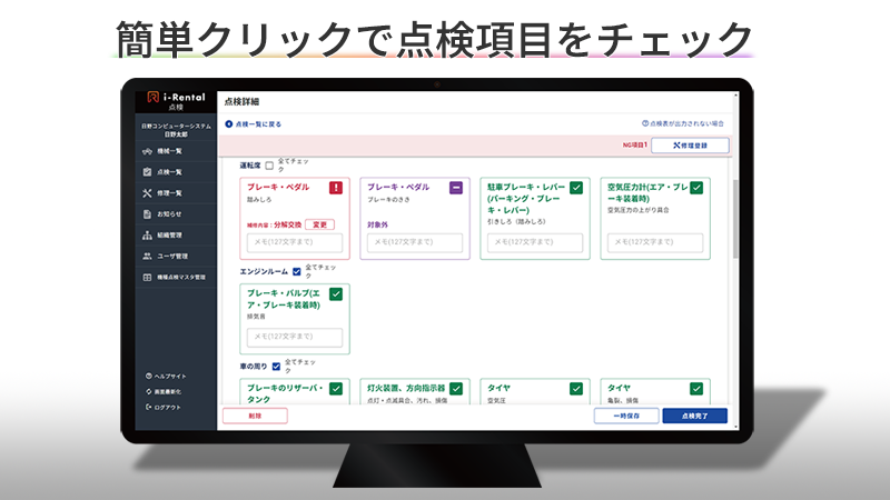 操作は直感的で、点検項目をチェックするだけで結果の登録が可能。点検情報は、異なる色で登録されます。