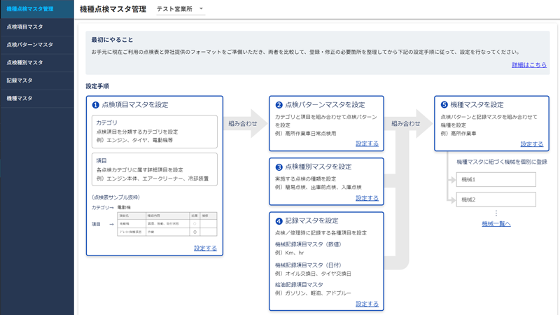 マスタ登録機能では、点検項目、点検種別、機種情報を新規に登録が可能。